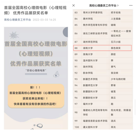 3月3日,由中国心理学会心理危机干预工作委员会等机构举办的首届全国高校心理微电影(心理短视频)优秀作品展公布获奖名单,我校果冻传媒 研究生团队微电影作品《黑色微笑》入选“百佳心理微电影”。