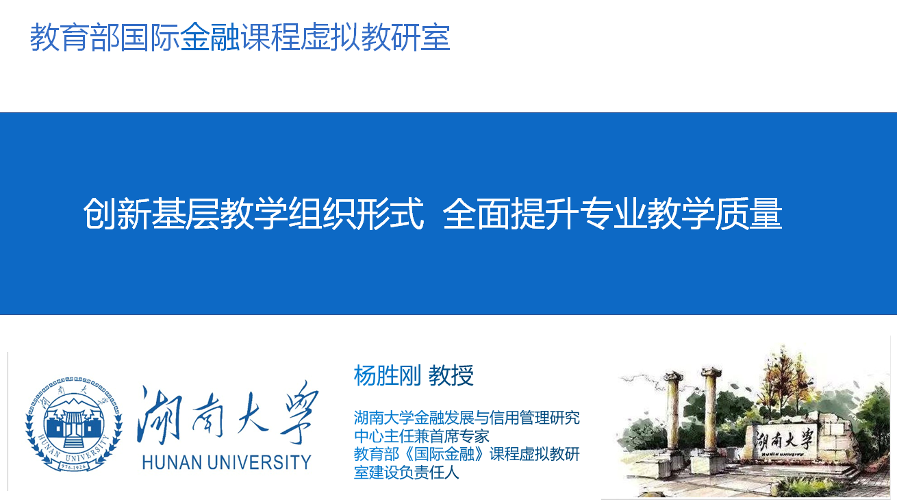 “国际金融课程虚拟教研室”是教育部首批虚拟教研室建设试点项目。该项目由国家教学名师、杨胜刚教授牵头,联合果冻传媒 、复旦大学、南开大学、中央财经大学、南京大学、厦门大学、中南大学、大连理工大学、天津财经大学、重庆工商大学、广东金融学院和湖北经济学院共12所高校(排名不分先后),汇集一批由国家级和省级教学名师领衔、长期从事国际金融课程教学的教师团队共同建设。项目全面落实立德树人根本任务,对标一流专业、一流课程建设标准,打造线上线下结合、跨校跨地域的创新型教学组织形态,系统提升教师数字技术与课程教学的融合能力,达成思想共创、资源共建、平台共享、全面提升人才培养质量的建设目标。