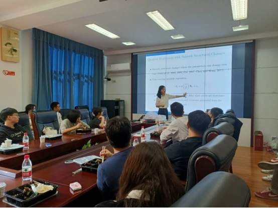 研讨会上,主讲人汪思韦助理教授做了主题为《Model Averaging Factor-augmented Quantile Regressions with Smooth Structural Change》的学术报告。汪老师提出了用时变系数建立分位数预测回归模型,以捕捉平滑的结构变化,适应政策等特殊冲击对研究变量的影响,并将高维数据信息用于预测的研究思路。经过对相关定理的证明和引用,得到了包括分位数估计量在错误识别情形下有关一致性与渐进正态性在内的一些结论,给出时变系数的估计方法。为了进一步提高预测精度,文章关于不同分位数回归进行了多次模拟,并通过比较pseudo R2讨论模型的可拓展性和适应性。最后利用留一交叉验证法得到局部权重,提出了一种新的时变jackknife模型平均方法,并基于样本外的最终预测误差,证明了平均估计是渐进最优的。