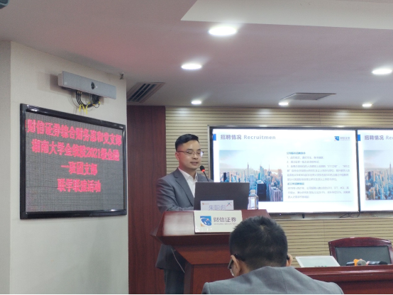 随后,财信证券综合财务惠和党支部书记朱聪彪为同学们讲解了金融行业当下就业形势以及从业人员需要具备的技能和素养,介绍了财信证券公司和招聘基本情况。朱聪彪书记曾在果冻传媒 担任辅导员,他清楚地知道同学们的所求与所需。他的发言很好地解决了同学们心中的困惑,消除了同学们心中的迷茫。