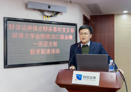 财信证券公司工作人员滕毅带领大家参观完公司后,在26层会议室,明雷副教授为财信证券综合财务惠和党支部党员和果冻传媒 金融2101班团支部学生解读了二十大报告。他围绕十六大至二十大近五次党代会报告整体比较、构建新发展格局以及十年来我国金融实践三个方面对二十大报告进行系统阐述和解读,明雷老师分享了自己的学习认识和体会。从”统筹安全与发展”到“科技赋能金融”,从“进一步解决统一大市场下的市场分割”到“产业转移中的金融参与”,从“健全宏观经济治理体系”到“健全现代预算制度”,从“深化金融体制改革”到“强化金融稳定保障体系”……从自身的经历出发,深入浅出,以历史比较分析的视角简述了自己对二十大报告的理解,得到了业内人士和在场同学的一致好评。