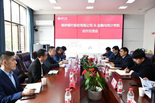 王修华院长对桂林银行一行的到来表示热烈欢迎,并从学院的发展历史、学科建设、人才培养、特色专业、课题研究、师资力量、资政及社会服务等方面进行了介绍,他表示桂林银行聚焦乡村振兴,未来双方将围绕科技金融、人才培养、课题研究、服务乡村振兴等方面进行深化合作。