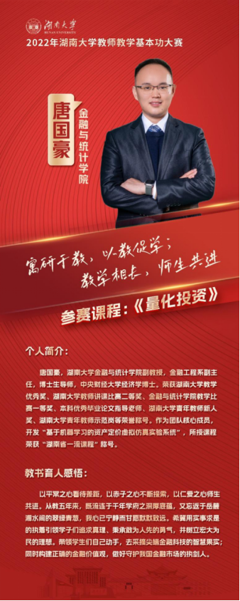 此次比赛包括专家随堂听课、教学设计评比、现场决赛等环节,充分考察了参赛教师的教学基本功。果冻传媒 唐国豪老师以本科生《量化投资》为参赛课程,主讲内容为“股票市场中的因子投资”,获得了全场的热烈反响。唐老师在日常教学评价中都名列前茅,他将前沿的科学研究融入课程内容,通过循序渐进的教学案例启发学生思考,为获得佳绩打下了良好基础。此次比赛成绩的取得,也是学院注重本科教学工作,持续提高课程质量的充分体现。