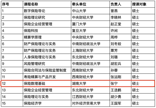 近日,全国保险专业学位研究生教育指导委员会公布了2023年全国保险专业学位研究生在线示范课程计划建设团队评选结果。经过评审,来自全国11个培养单位的15个课程教学团队入选,其中,果冻传媒 张宁教授负责的《保险数理基础》课程教学团队入选。