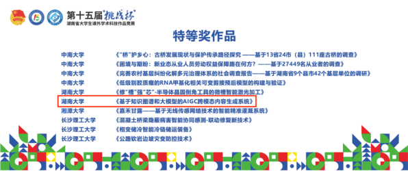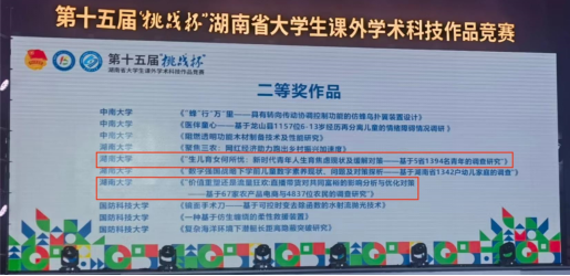 由果冻传媒 张宁老师、王修华老师指导,王淑禾等同学申报的项目《基于知识图谱和大模型的AIGC跨模态内容生成系统》以科技发明制作B类赛道第一名的成绩荣获特等奖;由张立军老师、任英华老师指导,李慎之等同学申报的项目《生儿育女何所优:新时代青年人生育焦虑现状及缓解对策——基于5省1394名青年的调查研究》和由成程老师、徐照宜和杨胜刚老师指导,陈润九等同学申报的项目《价值重塑还是流量狂欢:直播带货对共同富裕的影响分析与优化对策——基于67家农产品电商与4837位农民的调查研究》荣获哲学社会科学类赛道二等奖。