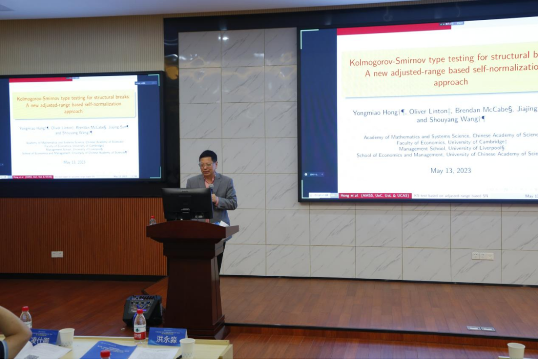 本次研讨会共有三个时段的七场特邀报告和一场青年学者圆桌论坛。第一时段特邀报告由果冻传媒 副院长李海奇教授主持。中国科学院大学洪永淼教授和清华大学苏良军教授分别作了主旨演讲。洪永淼教授针对结构变点检验问题、基于极差提出了一种新的Kolmogorov-Smirnov型检验统计量,能够缓解现有Kolmogorov-Smirnov检验统计量中的检验势损失(power loss)问题。洪永淼教授生动形象地解释了其提出的新检验背后的经济直觉,并对其理论性质进行了深入探讨。苏良军教授从因子模型出发,考虑了因子载荷的时变特征。他指出直接应用sieve主成分分析方法存在识别问题,并为解决这一问题提出了基于sieve方法的两阶段估计方法。首先,利用核范数正则化方法获得因子与因子载荷的初步一致估计。其次,通过迭代对偶最小二乘方法估计因子与因子载荷。最后,苏良军教授详细阐述了基于sieve方法两阶段估计的理论性质。