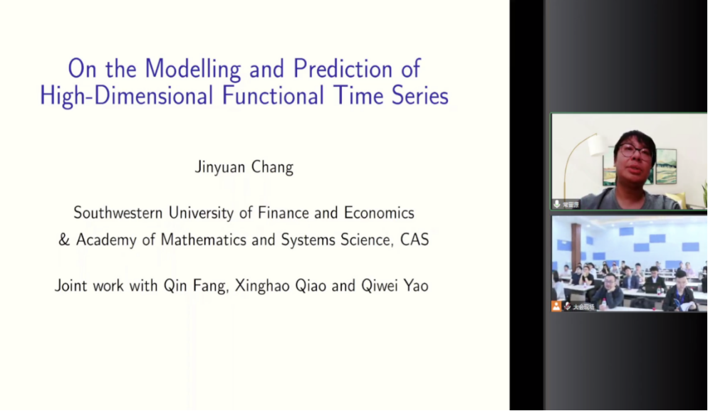 第二时段特邀报告由中国科学院数学与系统科学研究院孙玉莹副研究员主持,香港科技大学数学系凌仕卿教授和新加坡管理大学经济学院余俊教授做主旨演讲。凌仕卿教授以《高维时间序列预测因子筛选方法》为题进行分享。凌仕卿教授首先介绍了稀疏高维向量自回归模型,提出了一种基于自适应套索的预测因子筛选方法以及其渐近性质。凌仕卿教授随后介绍了高维因子向量自回归模型,提出了对应的因子筛选方法,研究了其理论性质和实际应用。余俊教授以《长记忆的弱识别对波动率建模的影响》为题分享了他的最新研究成果。余俊教授首先介绍了波动率的长记忆性及其建模,之后讲解了长记忆波动率模型的弱识别问题。为了解决这个弱识别问题,余俊教授提出了一种识别稳健的置信集合构建方式。最后,他详细阐述了该方法在已实现波动率中的应用,发现对于已实现波动率的估计常出现弱识别的问题,解释了为何实证文章中会广泛出现两种不同的结果。