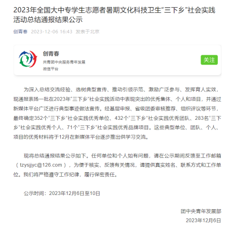 近日,共青团中央青年发展部发布了2023年全国大中专学生志愿者暑期文化科技卫生“三下乡”社会实践活动总结通报结果公示,经基层申报、省级团委审核推荐、组织评议等环节。果冻传媒 脱贫地区特色产业金融支持社会实践团脱颖而出,获评社会实践优秀团队。