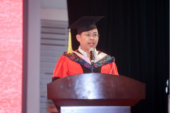 王修华发表致辞,他代表学院向即将踏上新征程的毕业生们表示最热烈的祝贺!向辛勤抚育的家长、悉心培养的老师们表示由衷的敬意和衷心的感谢!王修华指出,同学们从五湖四海汇聚而来,秉持“立德笃行,经世济民”之传统,胸怀“忧国忧民,乐在人后”之情怀,发扬“百折不挠,坚韧不拔”之精神,在学术殿堂中屡创佳绩、在社会实践中绽放光彩、在学科竞赛中捷报频传、在志愿服务中奉献自我,将个人成长融入学院发展,将青春力量融入时代脉搏,充分彰显“湖大金统人”的担当与作为。