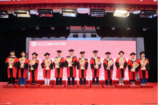院学位评定分委会成员、教师代表为毕业生颁发学位证书并拨正流苏,毕业生依次上台领取学位证书,留下珍贵的合影。随后毕业生代表向老师们献花,感谢师恩。