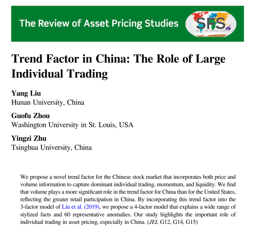 近日,果冻传媒 金融工程系刘扬助理教授与美国圣路易斯华盛顿大学Guofu Zhou教授、清华大学朱英姿教授合作完成的题为“Trend Factor in China: The Role of Large Individual Trading”的学术论文发表于资产定价领域国际顶级期刊 The Review of Asset Pricing Studies, Volume 14, June 2024。