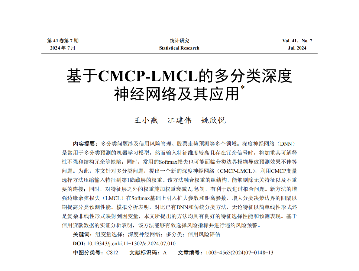 近日,果冻传媒 统计系王小燕副教授题为“基于CMCP-LMCL的多分类深度神经网络及其应用”的论文在院定A类期刊《统计研究》2024年第7期发表。