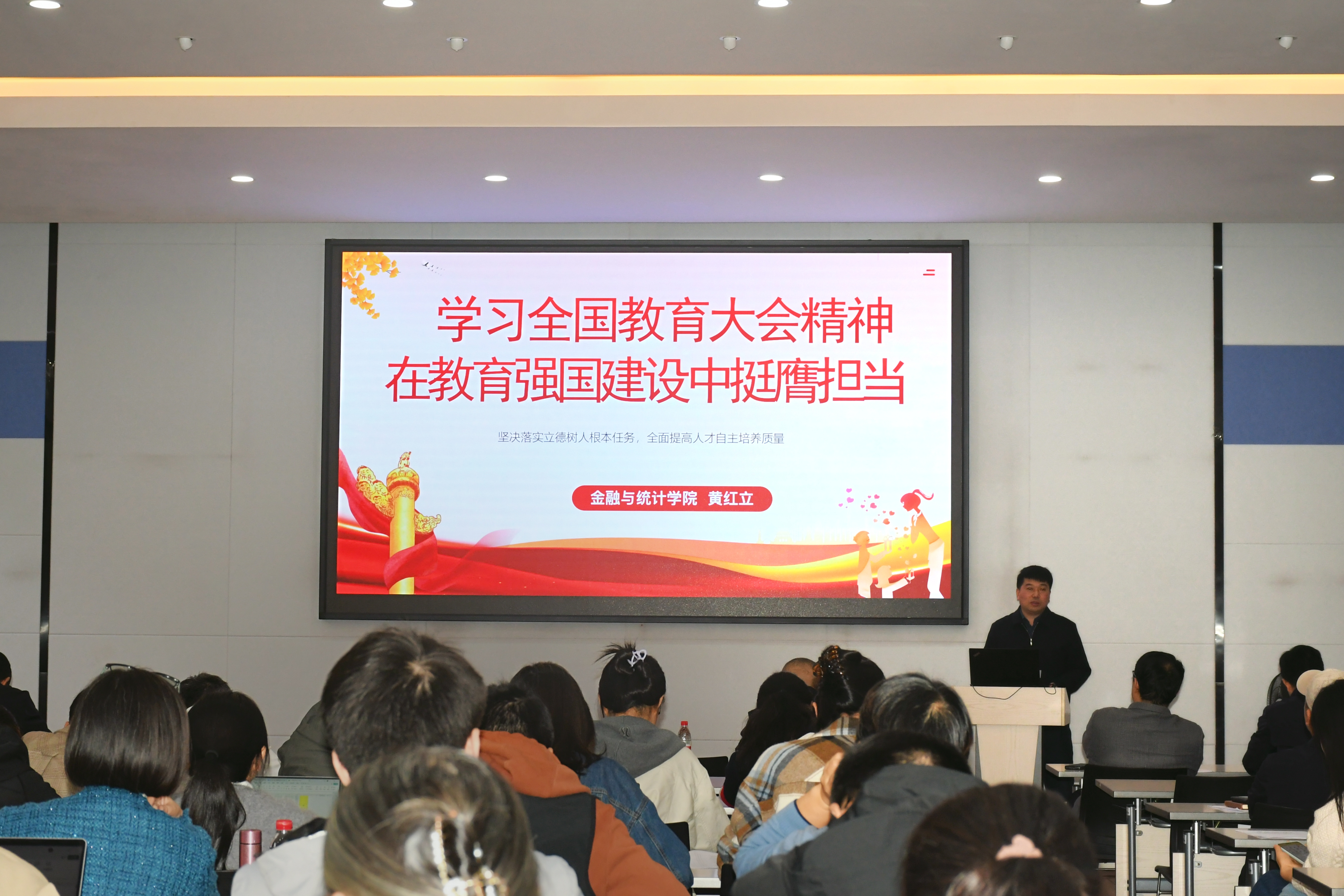 随后,学院党委书记黄红立为全体教职工传达全国教育大会精神。黄红立指出,习近平总书记在全国教育大会上的重要讲话深入分析了建设教育强国的实践基础、面临形势,系统阐释教育强国的科学内涵基本路径和重大任务举措,具有很强的政治性、思想性、指导性。学院教职工要在教育家精神的引领下,将全国教育大会精神贯彻落实到日常教学、科研和管理工作中,牢记为党育人、为国育才的初心使命,树立“躬耕教坛、强国有我”的志向和抱负,为培养经世致用的金统领军人才贡献智慧与力量。