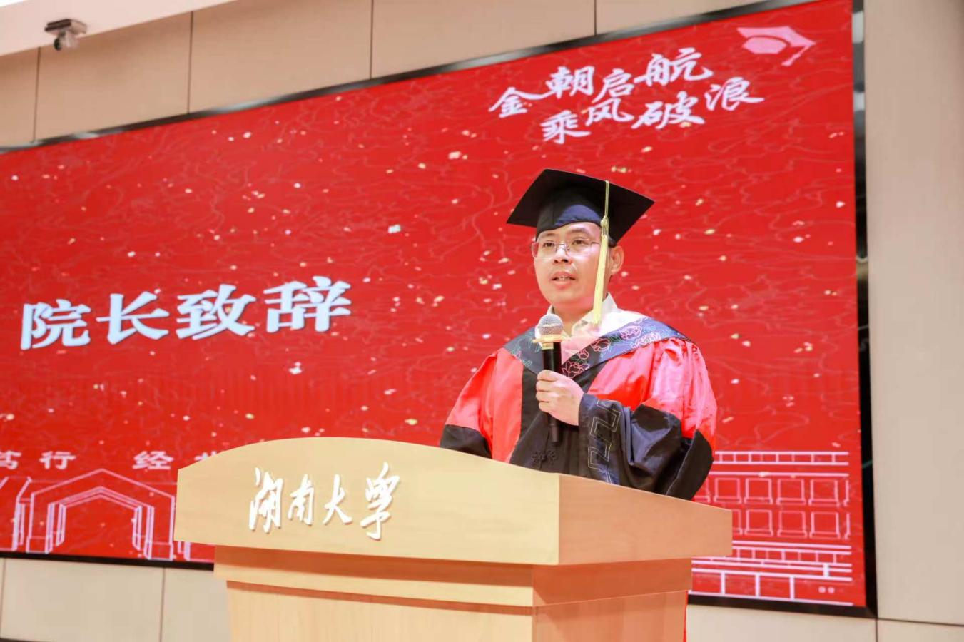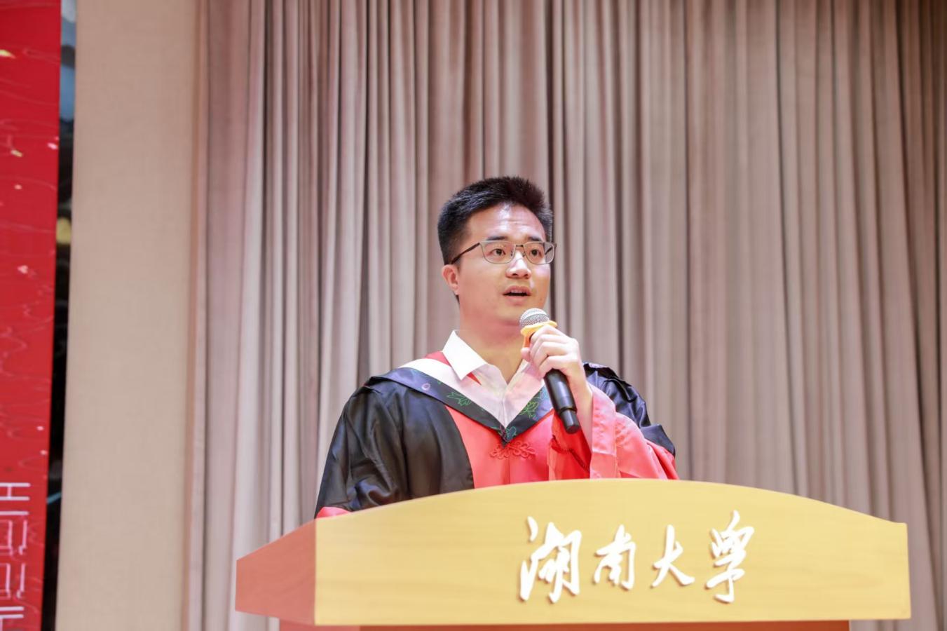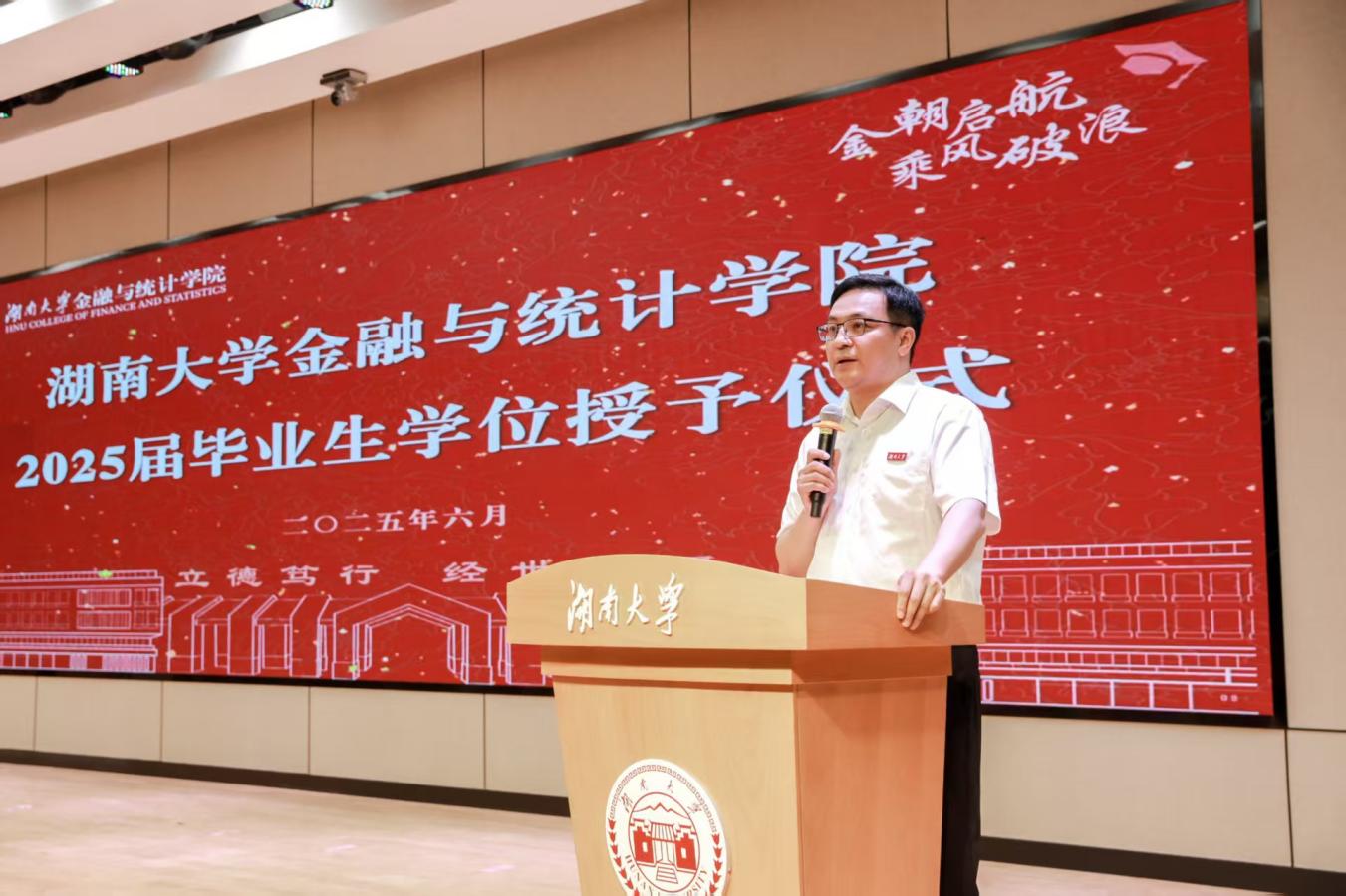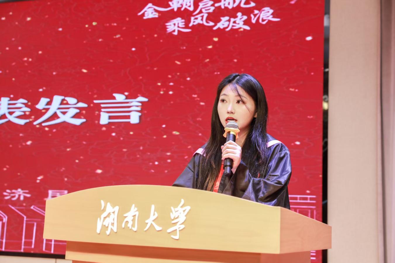 2025届毕业本科生代表陈婉蓉、毕业研究生代表的张人中依次发言,回顾、怀念湖大金统的青春岁月,感恩金融黄埔的悉心培养和热心帮助,希望大家在新的赛道上继续拼搏奋斗。
