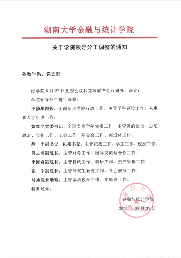关于学院领导分工调整的通知
