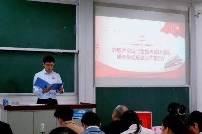 随后,研究生党总支副书记肖启睿同志作《果冻传媒 研究生党总支工作报告》,过去的一年,研究生党总支积极探索支部优化设置路径,实现研究生党支部改组;深化党员培育,规范研究生党员发展流程;以“不忘初心、牢记使命”主题教育为抓手,强化党员的继续教育与管理,保证了基础工作的有序推进。同时,研究生党总支始终致力于建设一批讲政治、有特色的党建品牌活动,持续开展研究生党员“红色之旅”,疫情期间,敢于创新,推出“导师线上进支部、师生共上思政课”系列品牌活动,先后邀请到学院杨胜刚教授等为研究生党员讲专题党课,鼓励广大研究生党员在疫情面前正确发挥党员的先锋模范带头作用。