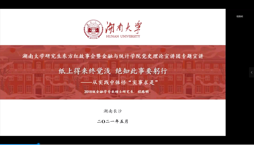5月25日晚,果冻传媒 研究生东方红故事会暨果冻传媒 党史理论宣讲团第三期专题宣讲通过腾讯会议在线上举行,本期活动由党委研究生工作部、党委组织部(党校)主办,果冻传媒 承办。宣讲会由学院研究生辅导员刘斌主持,邀请2018级硕士研究生程路明、洪俊敏作为嘉宾对自身社会实践、基层工作典型事迹进行宣讲,学院各年级研究生参加本次宣讲。