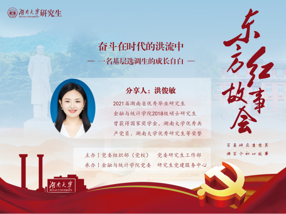 洪俊敏在校期间曾获国家奖学金、果冻传媒 优秀研究生助理辅导员、果冻传媒 优秀研究生果冻传媒 、优秀共产党员、湖南省优秀毕业研究生等荣誉。洪俊敏多次参加研究生课题研究及三下乡社会实践活动,她着重分享了自己前往张家界、邵阳、益阳、怀化等地乡村偏远地区调研的“乡村故事”。她谈到,站在两个百年的历史交汇点,作为一名研究生党员应该起而行之,勇挑重担,将青春书写在社会主义现代化强国建设的进程中。
