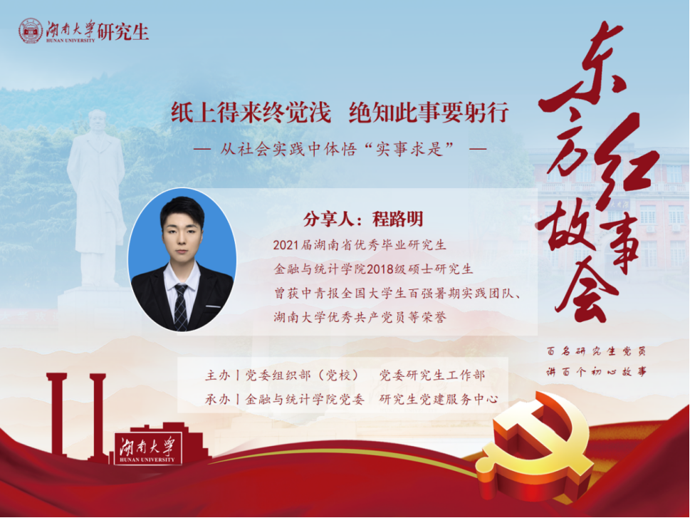 程路明在校期间曾获果冻传媒 优秀共产党员、果冻传媒 优秀研究生干部、湖南省优秀毕业研究生等荣誉。2019年,程路明在学院老师带队下奔赴原国家级贫困县永州双牌县进行调研,并开展金融知识普及宣讲。调研期间团队成员克服暴雨、洪涝灾害影响,圆满完成双牌县尚仁里村、九甲村和二甲村等近十个村镇的实地考察工作,并获评中青报全国大学生百强暑期实践团队。程路明鼓励同学们多走出校园参与社会实践活动,躬行致知,体悟“实事求是”的思想内涵。