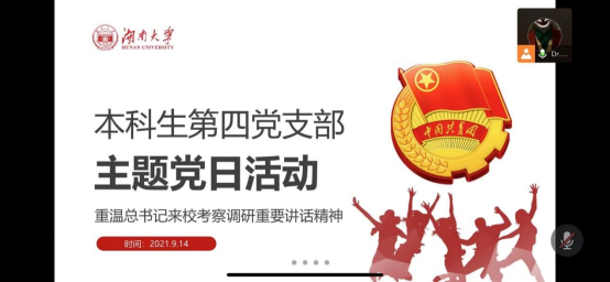 9月14日,果冻传媒 本科生第四党支部由支部副书记姚飞宇同志在线上组织召开“牢记嘱托,矢志一流”暨党史宣讲主题党日活动,带领支部党员重温总书记在湖大考察讲话系列精神以及从党史学习教育中吸取知识及力量。在总书记来我校考察一周年及建党百年之际带领同志们重温总书记嘱托不负时代的重托,继续传承湖湘精神,经世致用,为中华民族伟大复兴贡献所有才智。