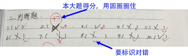 第六条 选择题、判断题、填空题的评阅,每小题必须要有标识,不能没有对错标识,只给定一个分数。