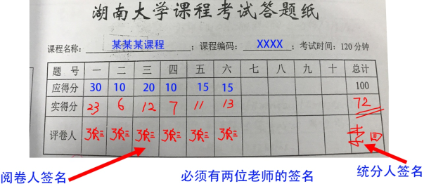 第七条 流水阅卷的试卷,各题阅卷教师须在答题纸第一页的记分栏中签名(全名),合分教师在最后统分栏签名(全名)。