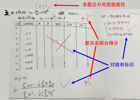 范例2 适用于大题。每大题应根据评分细则,先给出各要点的得分(正分),然后将该题的得分数标在题首处,用圆圈圈住。备注:习惯采用减分制的教师要特别注意该规范。